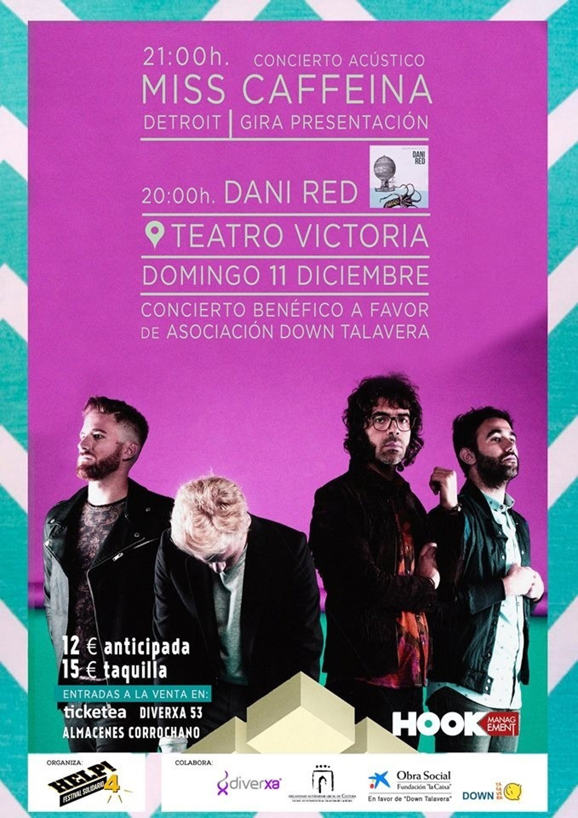 Miss Caffeina recalará en Talavera dentro de su gira nacional de presentación de su disco 'Detroit'. Como telonero actuará Dani Red, excomponente de Ukulele Clan Band, que también presenta trabajo discográfico, según ha informado en nota de prensa Help Festival.