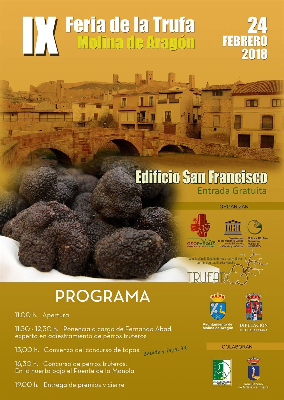 Este evento, organizado por la Asociación de Cultivadores y Recolectores de Trufa de Castilla-La Mancha (TRUFARC), el Geoparque Mundial de la UNESCO de la Comarca de Molina de Aragón-Alto Tajo, el Ayuntamiento de Molina de Aragón, la Diputación y la Asociación de Desarrollo Rural Molina de Aragón-Alto Tajo junto con 'La Común de Molina y su tierra', tendrá como acto central una degustación y concurso de tapas elaboradas con trufa que cocinarán los distintos restaurantes del Geoparque.
