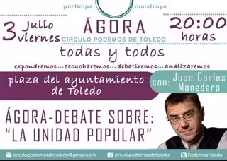 El exsecretario de Programa de Podemos Juan Carlos Monedero participará el próximo viernes, 3 de julio, en la ciudad de Toledo en el ágora-debate sobre 'Unidad Popular' que el Círculo Podemos de la capital regional ha organizado en la Plaza del Ayuntamiento a las 20.00 horas.