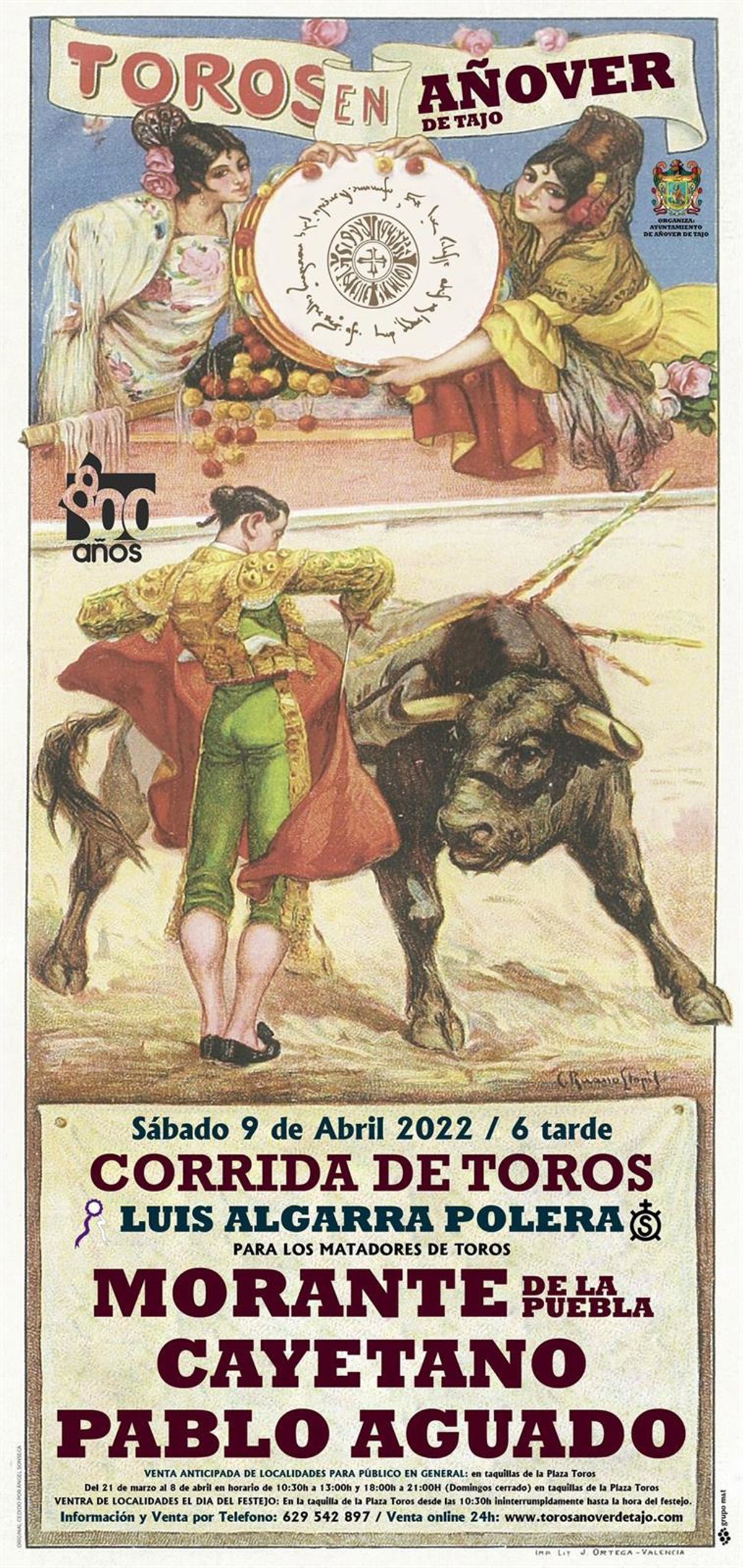 Añover del Tajo (Toledo) acogerá el 9 de abril una Monumental Corrida de Toros con Morante de la Puebla, Cayetano Rivera y Pablo Aguado, con motivo del 800 aniversario de la fundación del municipio toledano. Las entradas para esta cita se pueden adquirir hasta el 8 de abril en la taquilla de la plaza de toros, a través de su web o vía telefónica al 629 542 897, con precios desde los 35 euros.