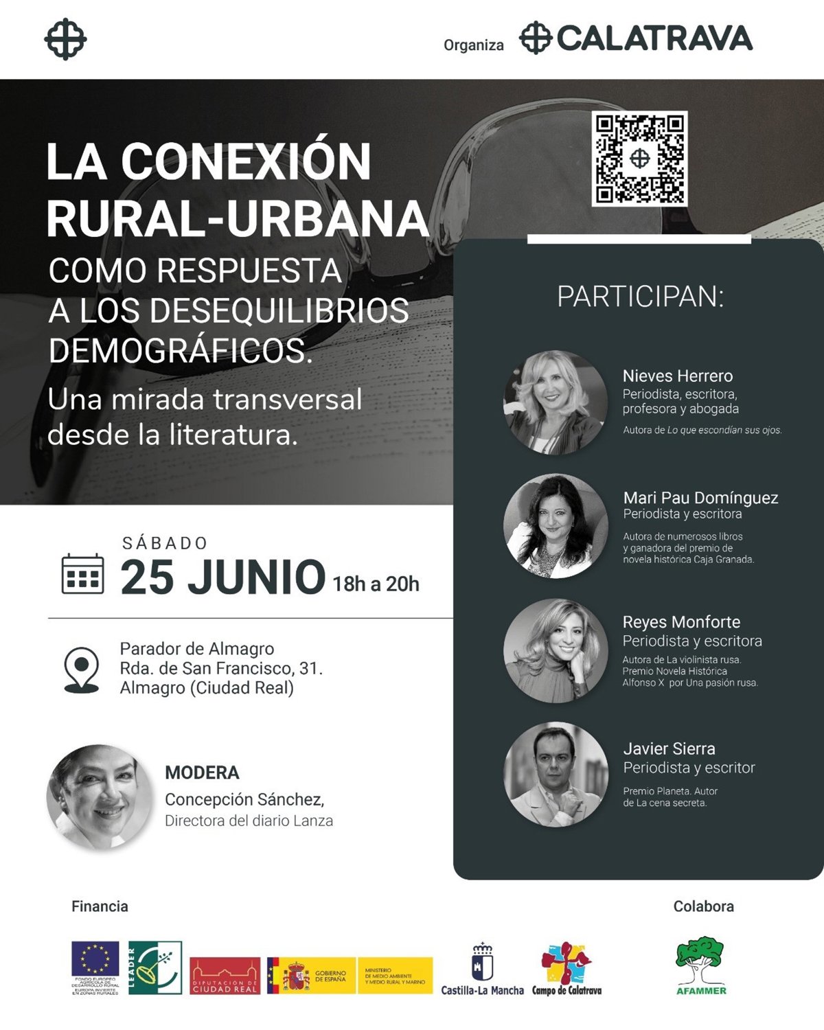 Nieves Herrero, Reyes Monforte, Javier Sierra y Mari Pau Domínguez, invitados por la Asociación para el Desarrollo del Campo de Calatrava, participan este sábado, 25 de junio, en el encuentro de escritores sobre 'La conexión rural-urbana como respuesta a los desequilibrios demográficos', acto del 22 Aniversario de la Asociación que tendrá lugar de 18.30 a 20.30 en el Parador de Almagro, con entrada abierta y gratuita con inscripción previa.