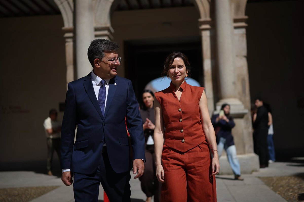 La presidenta de la Comunidad de Madrid, Isabel Díaz Ayuso,y el nuevo rector de la Universidad de Alcalá, Carmelo García, en la Universidad de Alcalá, a 20 de abril de 2026, en Alcalá de Henares, Madrid (España). - Alejandro Martínez Vélez - Europa Press