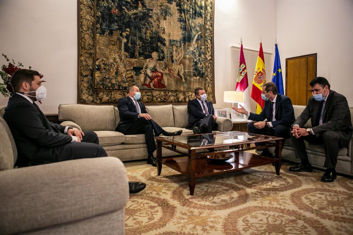 El presidente de Castilla-La Mancha, Emiliano García-Page, se reúne en el Palacio de Fuensalida con el alcalde de Albacete, Emilio Sáez, y el CEO de Eurocopter. - JCCM/DAVID ESTEBAN