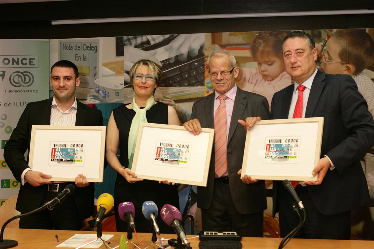 El delegado territorial de la ONCE en Castilla-La Mancha, Antonio Cebollada y el presidente del Consejo Territorial, José Martínez, han presentado este cupón en un acto al que también asistieron el Jefe del Área del Teatro del INAEM, Pablo de la Cruz Pérez; el alcalde de Almagro, Luis Maldonado y la directora del Festival, Natalia Menéndez.