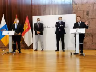El jefe del Ejecutivo autonómico, Emiliano García-Page, presenta, junto al presidente de Canarias, Ángel Víctor Torres, el convenio de cooperación entre ambas comunidades autónomas para el desarrollo del proyecto Historia Clínica Electrónica Estándar. - GOBIERNO DE CANARIAS