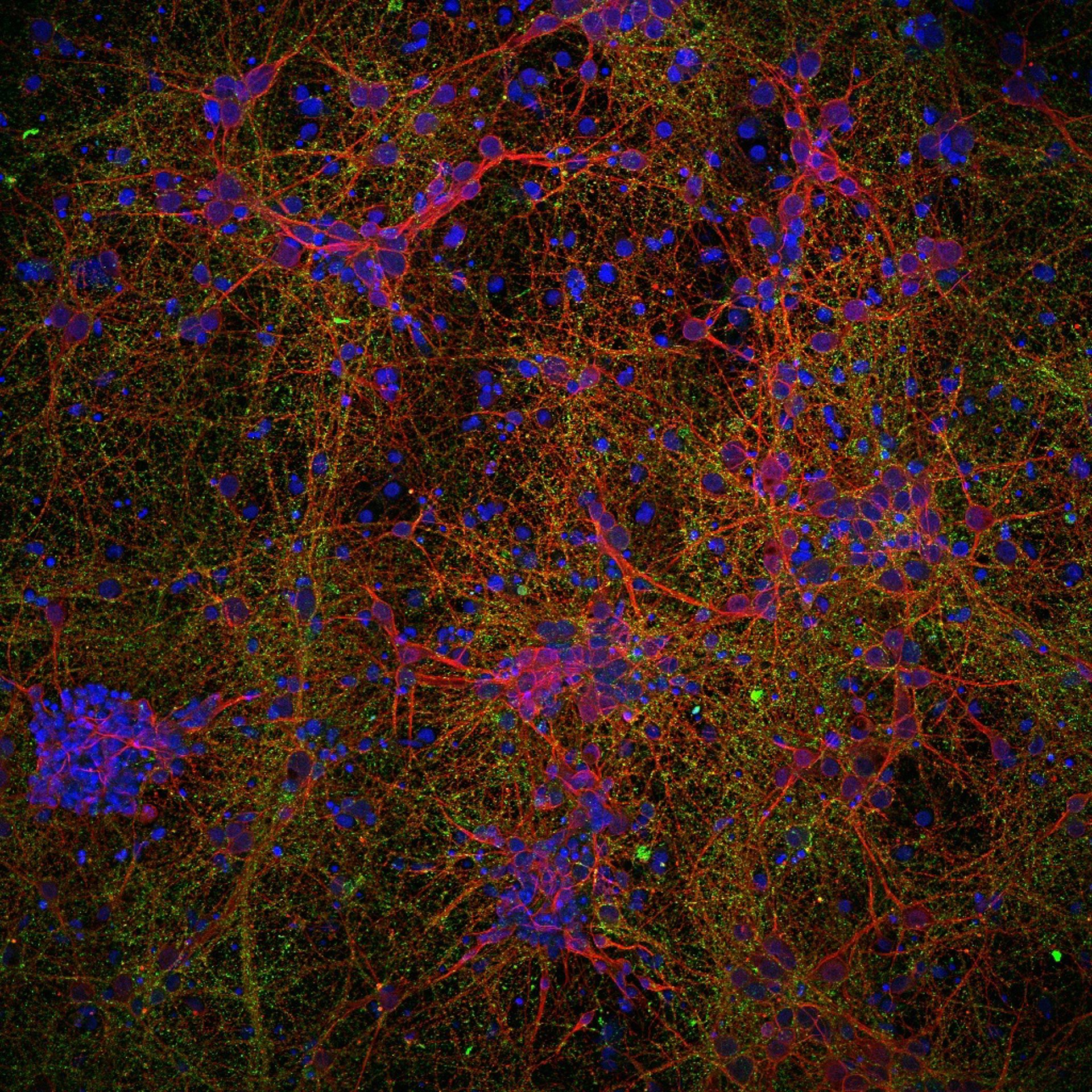 Imagen microscópica de células neurales con nanopartículas de óxido de hierro: neuronas (rojo), sinapsis (verde) y núcleos celulares (azul). - ICMM-CSIC