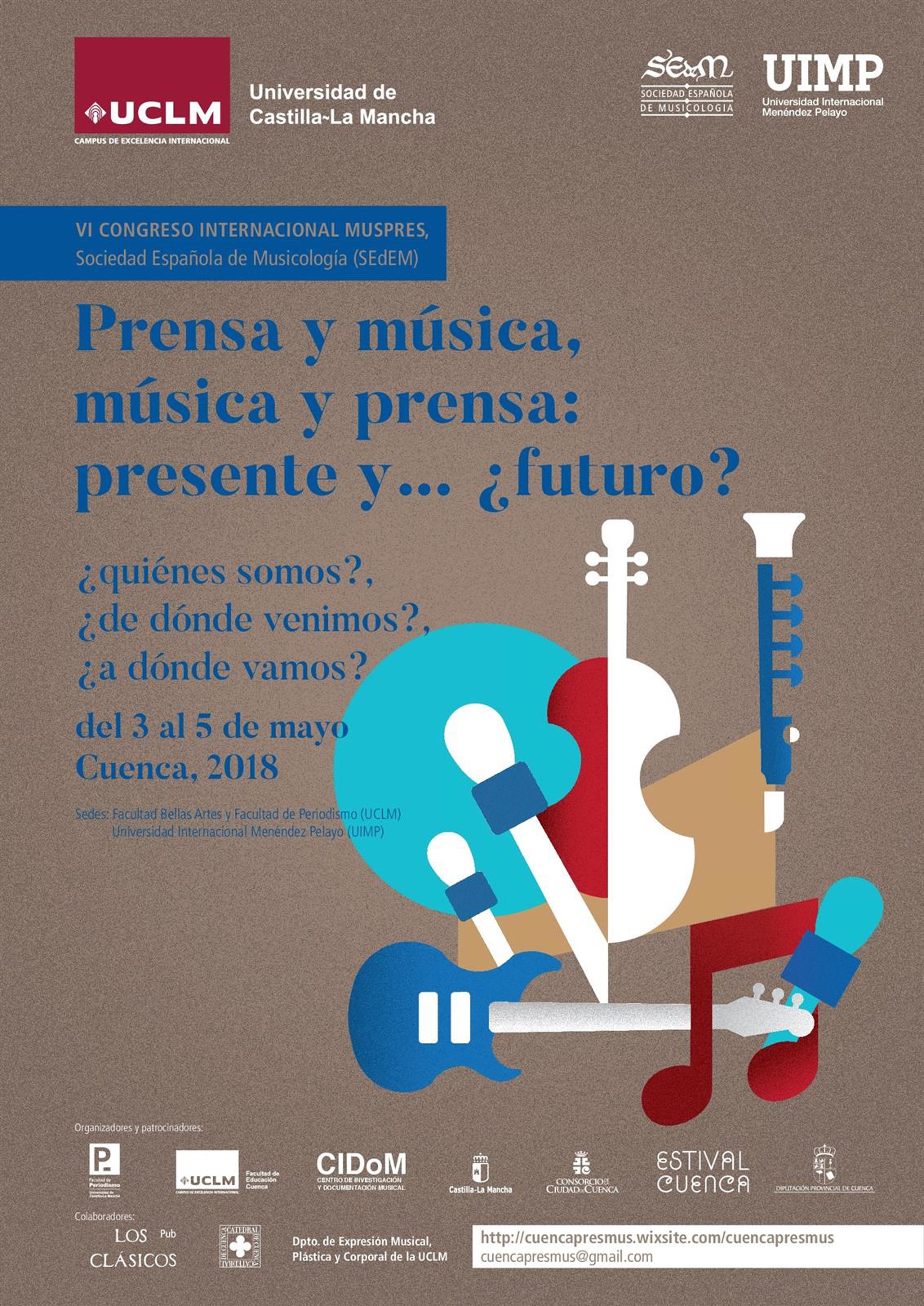 El congreso está organizado por el grupo de 'Música y prensa' de la Sociedad Española de Musicología (SEdEM), la Universidad de Castilla-La Mancha (UCLM), la Facultad de Periodismo (UCLM), la Universidad Internacional Menéndez Pelayo (UIMP), la Junta de Comunidades de Castilla-La Mancha (JCC), el Centro de Documentación e Investigación Musical (CIdOM), asociado al CSIC y el festival Estival Cuenca, de quien partió la iniciativa de presentar la candidatura de Cuenca, con la colaboración de la Facultad de Educación (UCLM), el Departamento.