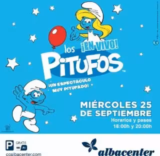 El Centro Comercial Albacenter entrará en un "mundo azul" cuando el próximo 25 de septiembre los entrañables personajes de Los Pitufos --con Papa Pitufo a la cabeza, Pitufina, Pitufo Vanidoso, El Pitufo Filósofo y el Pitufo Torpe-- invadan el centro junto al malvado Gargamel en el show 'Los Pitufos Live-Un Festival muy Pitufado'.