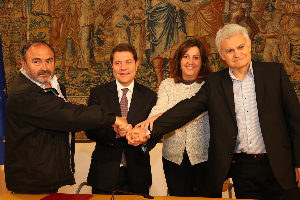 García-Page ha hecho este avance durante la firma del Acuerdo por el Empleo, en el que ha estado acompañado de los secretarios regionales de UGT y CCOO, Carlos Pedrosa y José Luis Gil, respectivamente, y de la consejera de Economía, Empresas y Empleo, Patricia Franco.
