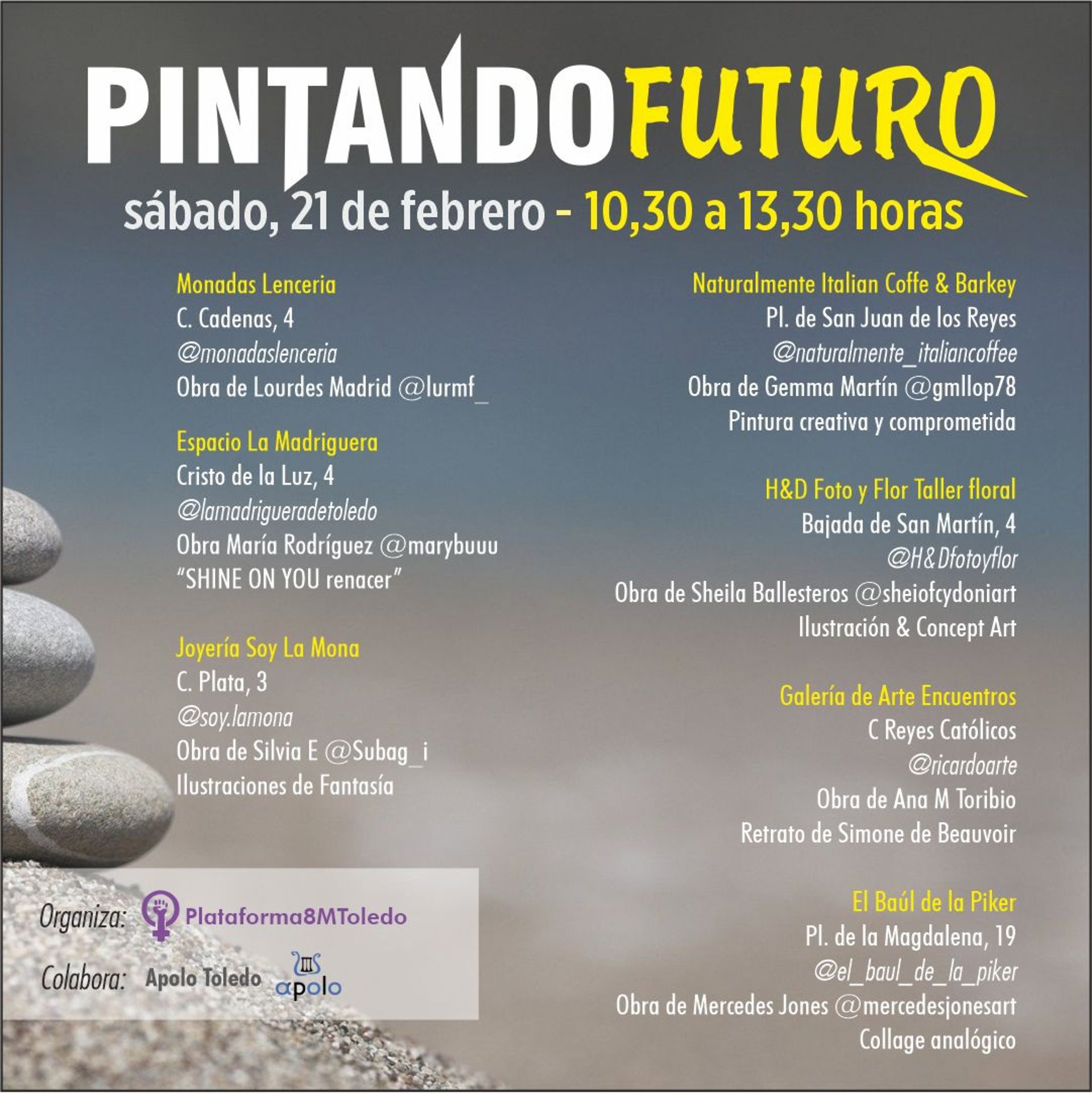 La Plataforma 8M Toledo organiza esta actividad en colaboración con algunas artistas de Apolo Toledo, además de otras aportaciones. Entre ellas están Gemma Martín pintora y creadora; Sheila Ballesteros ilustradora y creadora de arte conceptual; Ana M Toribio y su retrato de Simone de Beauvoir; Mercedes Jones y su Collage analógico; María Rodríguez y su 'Shine on you renacer'; Silvia E y sus Ilustraciones de Fantasía y por último, una obra de Lourdes Madrid.