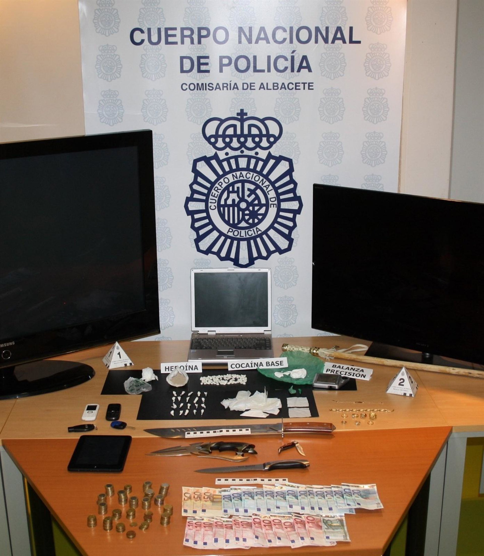 En el registro se intervinieron 337 dosis de cocaína base, pendiente de adulteración o corte, 376 dosis de heroína, 715 euros, utensilios para adulteración, elaboración y venta de droga, dos vehículos, televisores, y equipos electrónicos, una esclava de oro, un ordenador portátil, báscula de precisión y numerosos perfumes y prendas de vestir de primeras marcas.