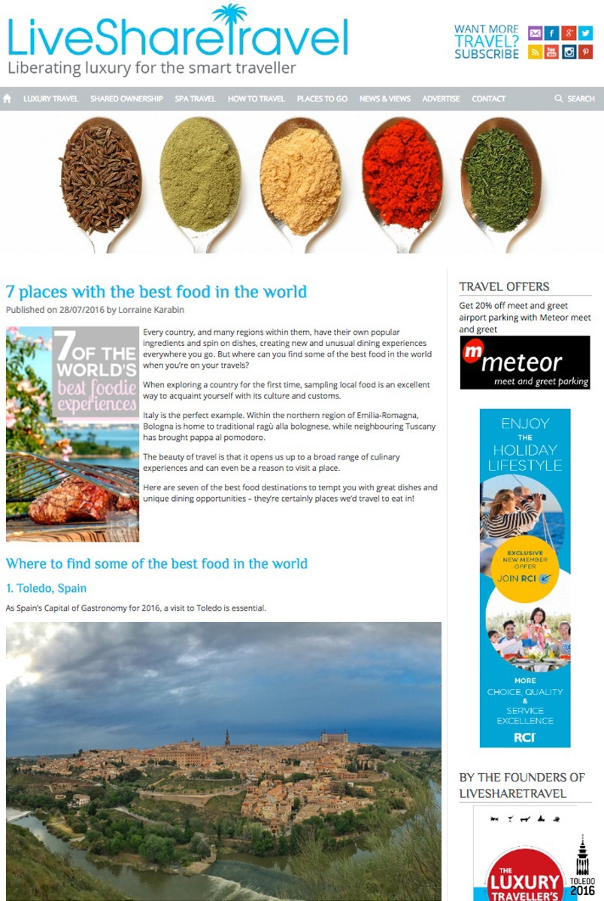 En su artículo, LiveShareTravel.com explica que la oferta culinaria de Toledo "sorprenderá al visitante por su gran variedad de localizaciones para disfrutar de la gastronomía, y por otro lado, por la fusión de sus ingredientes con los que se crean menús impresionantes".