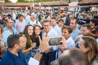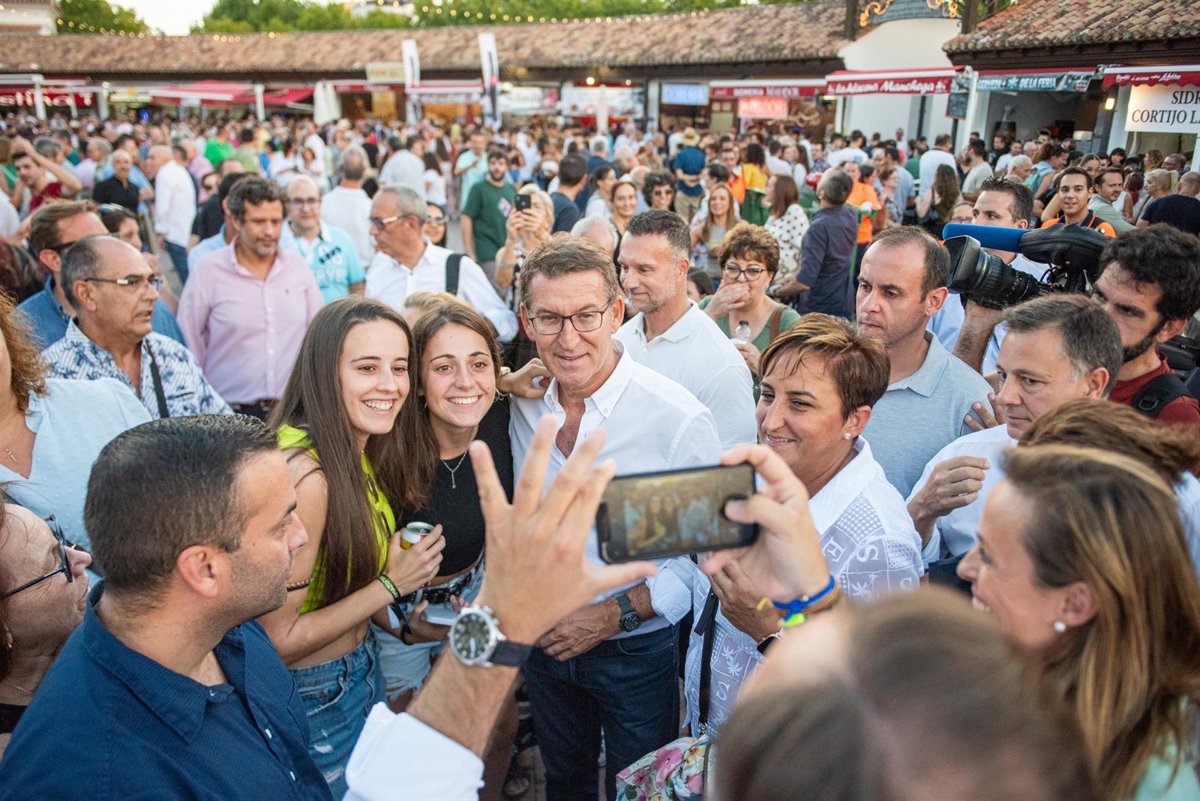 El presidente del PP, Alberto Núñez Feijóo (c), posa para una fotografía con simpatizantes durante su visita a la Feria de Albacete, en el Recinto Ferial, a 14 de septiembre de 2023, en Albacete, Castilla-La Mancha (España). La Feria de Albacete, declarad - Víctor Fernández - Europa Press