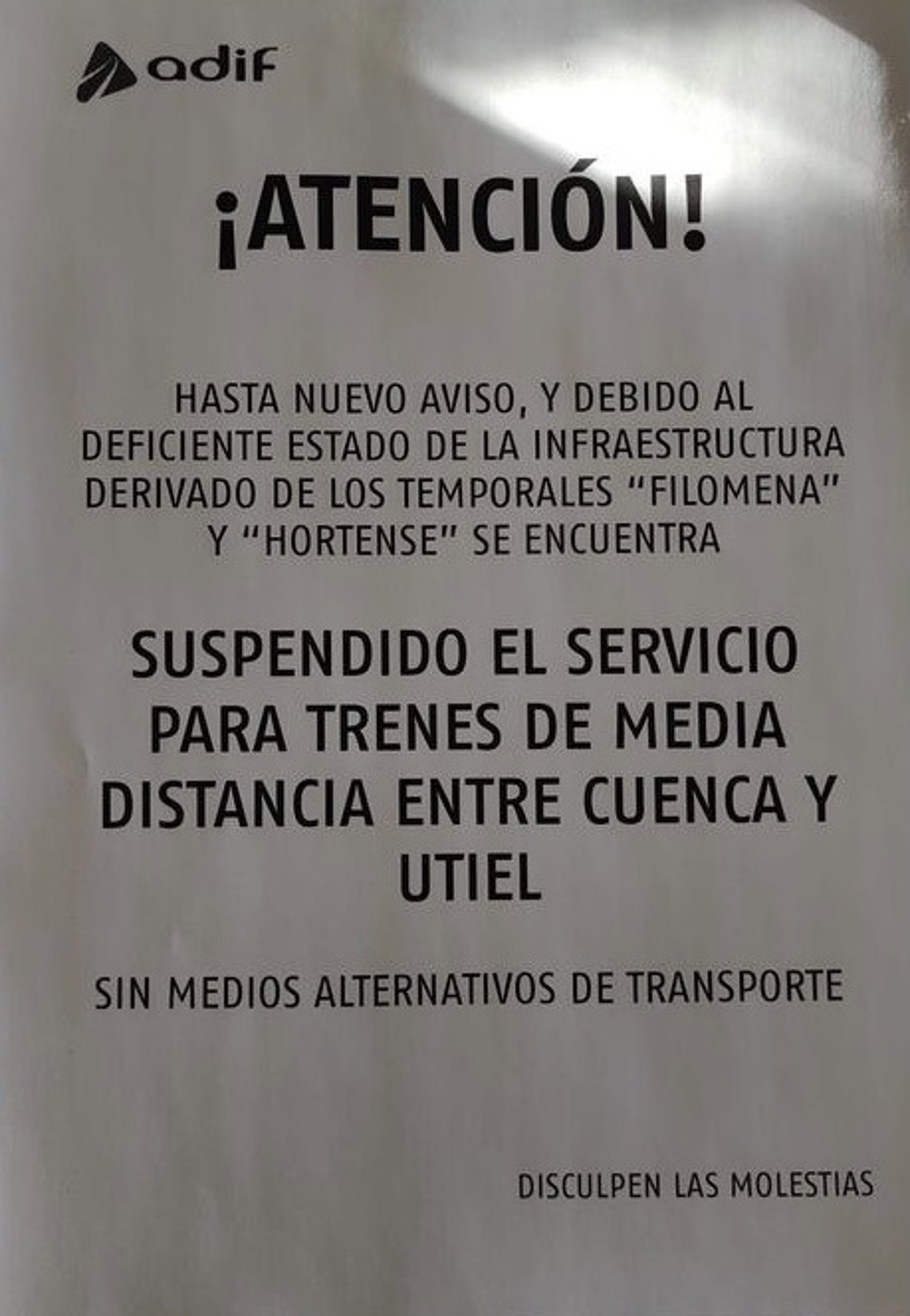 "El cartel en el que Adif anuncia que la conexión Cuenca-Valencia sigue suspendida no pasa de ser un folio de papel, con el logo de la empresa pública, en el que escuetamente cita a los temporales 'Filomena' y 'Hortense' como causantes de que la línea siga interrumpida y deja claro que no hay medios alternativos de transporte. Piden disculpas por las molestias, pero este problema ya no admite más disculpas", ha denunciado.