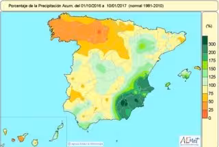 La portavoz de la AEMET, Ana Casals, ha señalado que las lluvias acumuladas desde el 1 de octubre hasta el 10 de enero alcanzan 215 litros por metro cuadrado, lo que representa un 17 por ciento menos que el valor medio normal que corresponde a ese periodo, que son 259 litros por metro cuadrado.