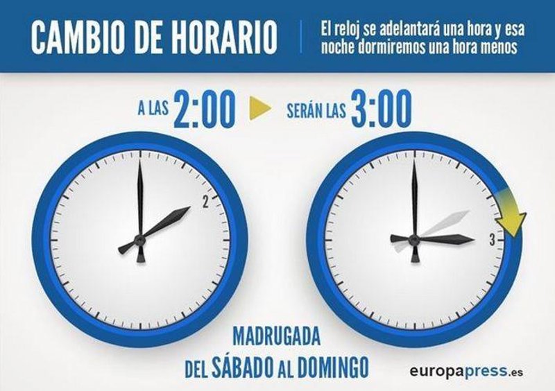 La madrugada de este domingo, 27 de marzo, comenzará el 'horario de verano' ya que a las 02.00 horas se adelantarán una hora los relojes hasta las 03.00 horas. El cambio obedece a una Directiva Comunitaria dirigida a favorecer el ahorro energético.