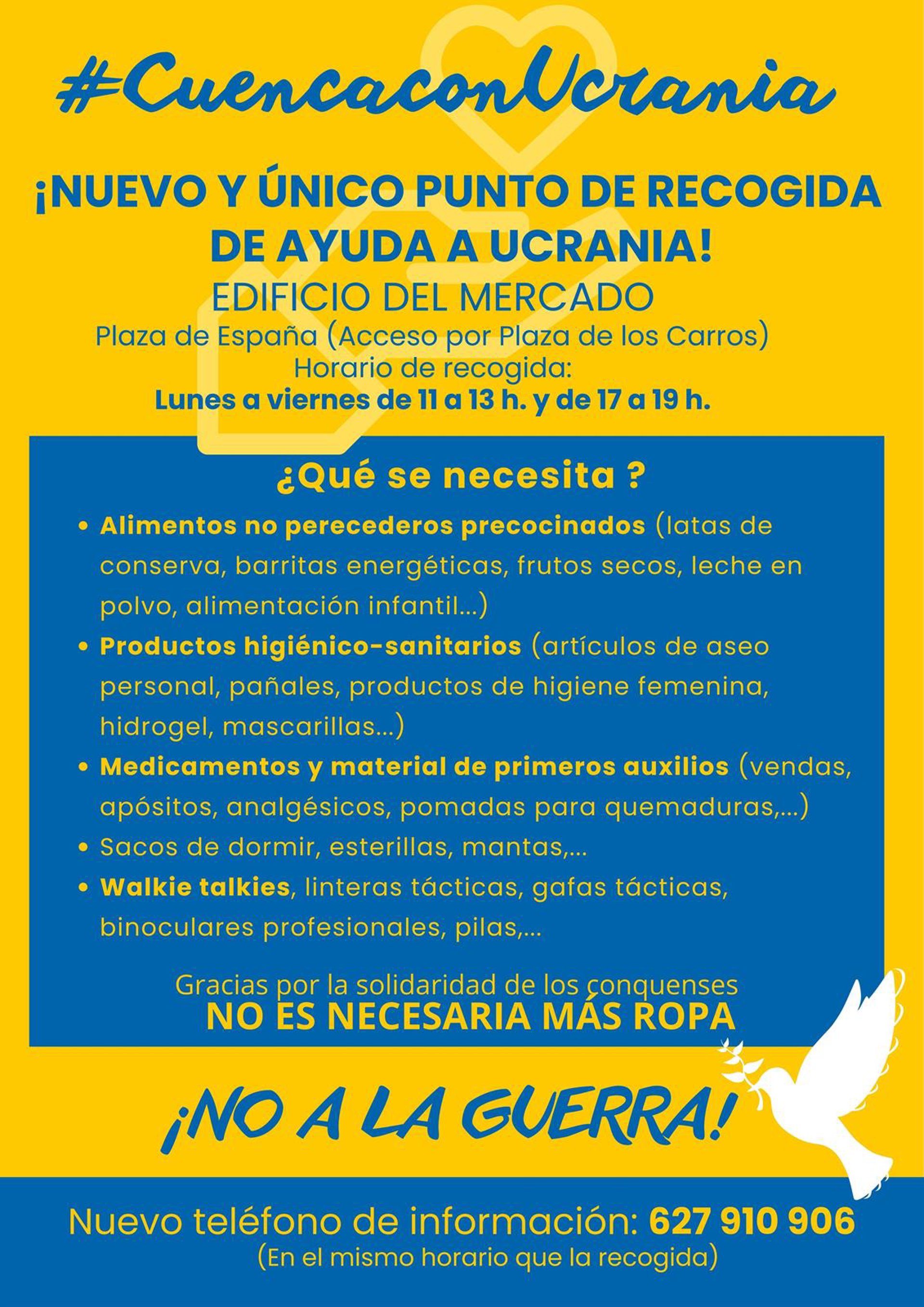 De este modo, a partir del lunes 7 de marzo, el punto de recogida de ayuda a Ucrania se traslada al edificio del Mercado, concretamente a la planta donde se encuentran los comercios, situándose a el acceso por la Plaza de los Carros.