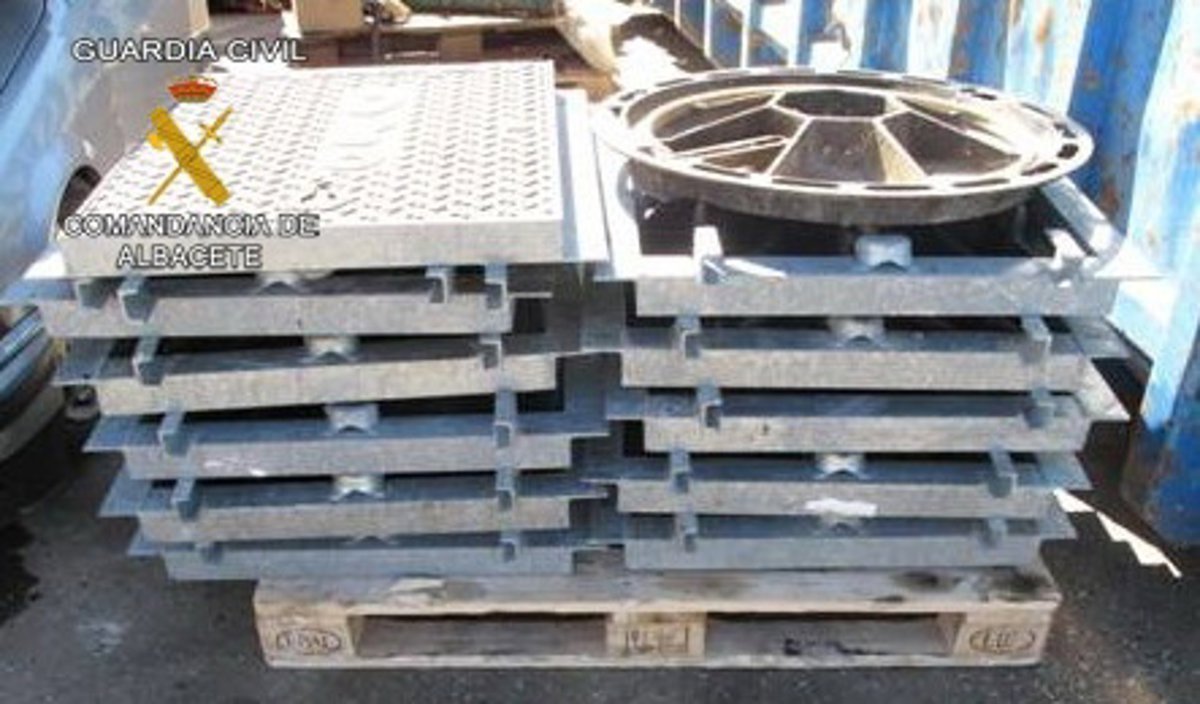 En esa inspección la Guardia Civil encontró 13 tapas de hierro, 11 de ellas con las inscripciones de una empresa de telecomunicaciones y otras dos pertenecientes al alcantarillado del Ayuntamiento de Albacete.