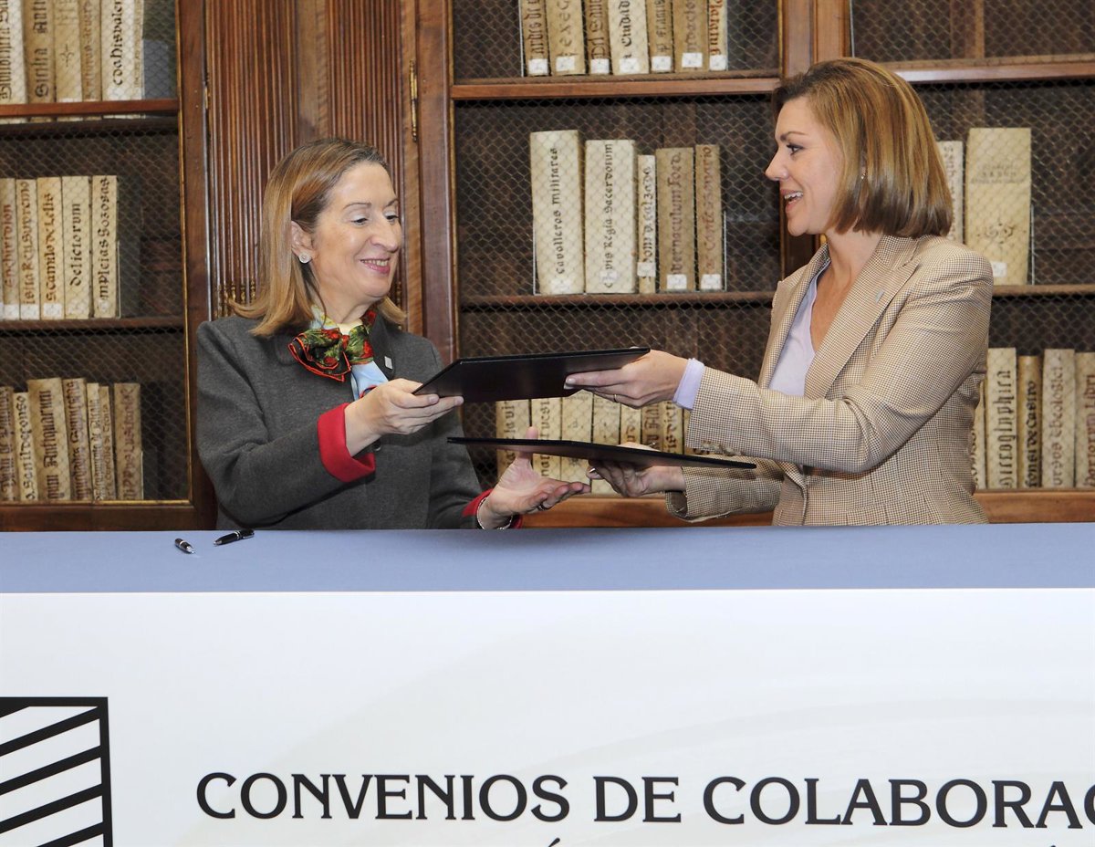 La ministra de Fomento, Ana Pastor, ha firmado junto a la presidenta de Castilla-La Mancha, María Dolores de Cospedal, sendos convenios entre Adif y Renfe y la Junta de Comunidades de Castilla-La Mancha para la promoción del programa de actividades que se va a realizar a lo largo de 2015 con motivo de la celebración del IV Centenario de la publicación de la segunda parte de El Quijote.