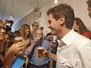 El presidente de Ciudadanos, Albert Rivera (3i) se toma una caña junto al secretario de Organización de Castilla La-Mancha por Ciudadanos, Alejandro Ruiz (2i), entre otras autoridades, en el encuentro 'Vamos de cañas con Albert Rivera' en el bar `La F - Belén Monge - Europa Press