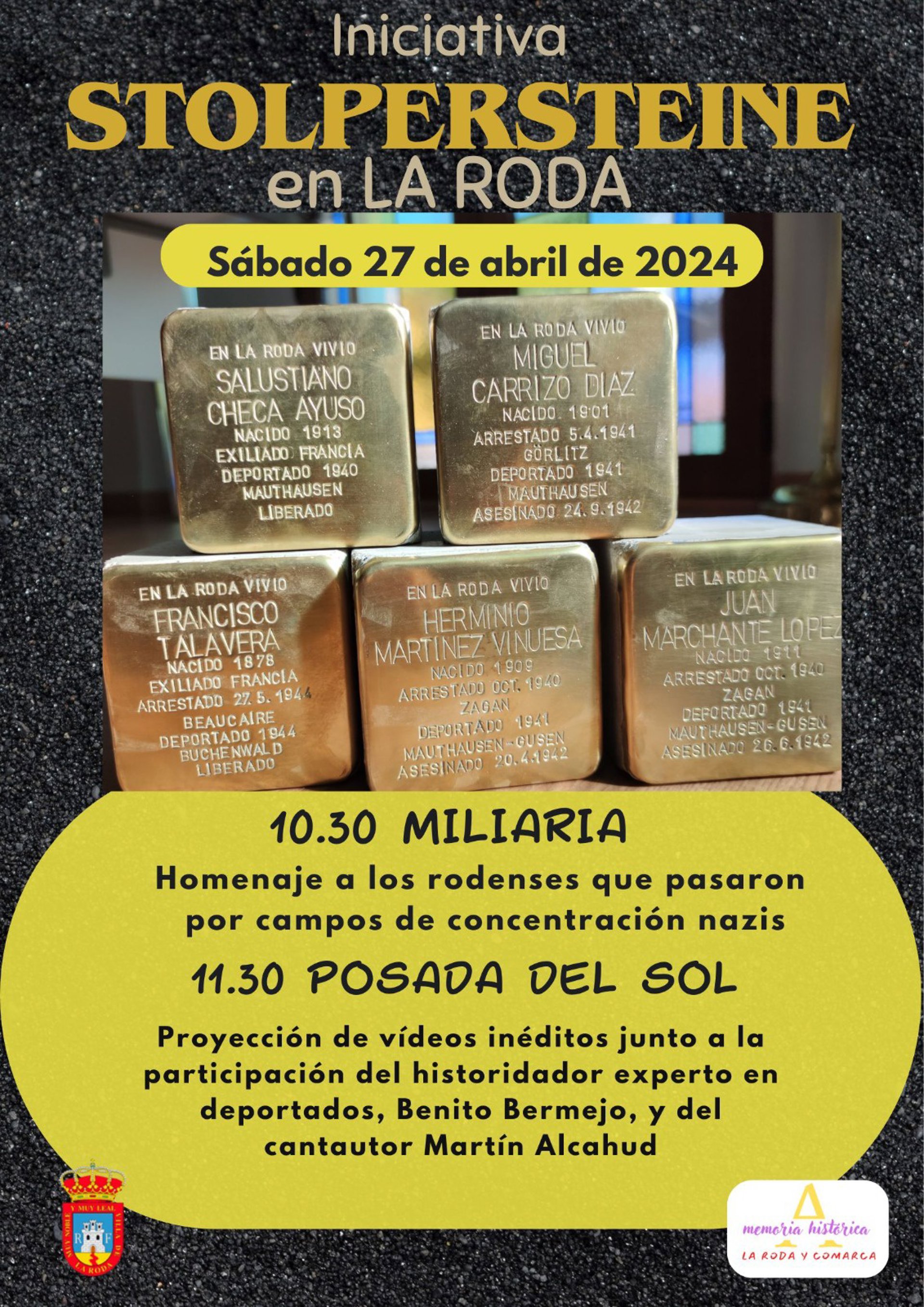 La presidenta de la Asociación Memoria Histórica de La Roda y Comarca ha explicado que, tras la colocación de los Stolpersteine en la zona de La Miliaria habrá un encuentro en la Posada del Sol con Benito Bermejo, un "investigador pionero sobre españoles deportados" al campo de concentración de Mauthausen, en el que además se proyectarán videos inéditos, como una entrevista que realizó a uno de los últimos supervivientes, Salustiano Checa. También habrá música de la mano del cantautor Martín Alcahud y "algunas sorpresas más".