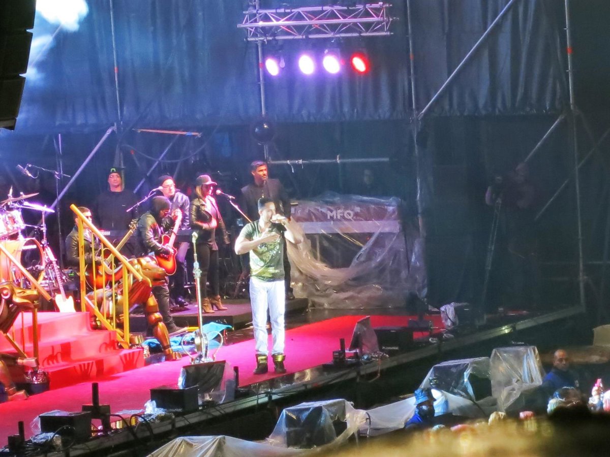 Santos ha comenzado el concierto con cuarenta minutos de retraso, aunque no por ello sus seguidores han dejado de corear su nombre y de vitorearle con cada tema de su repertorio, armados con paraguas y chubasqueros para calmar el agua.