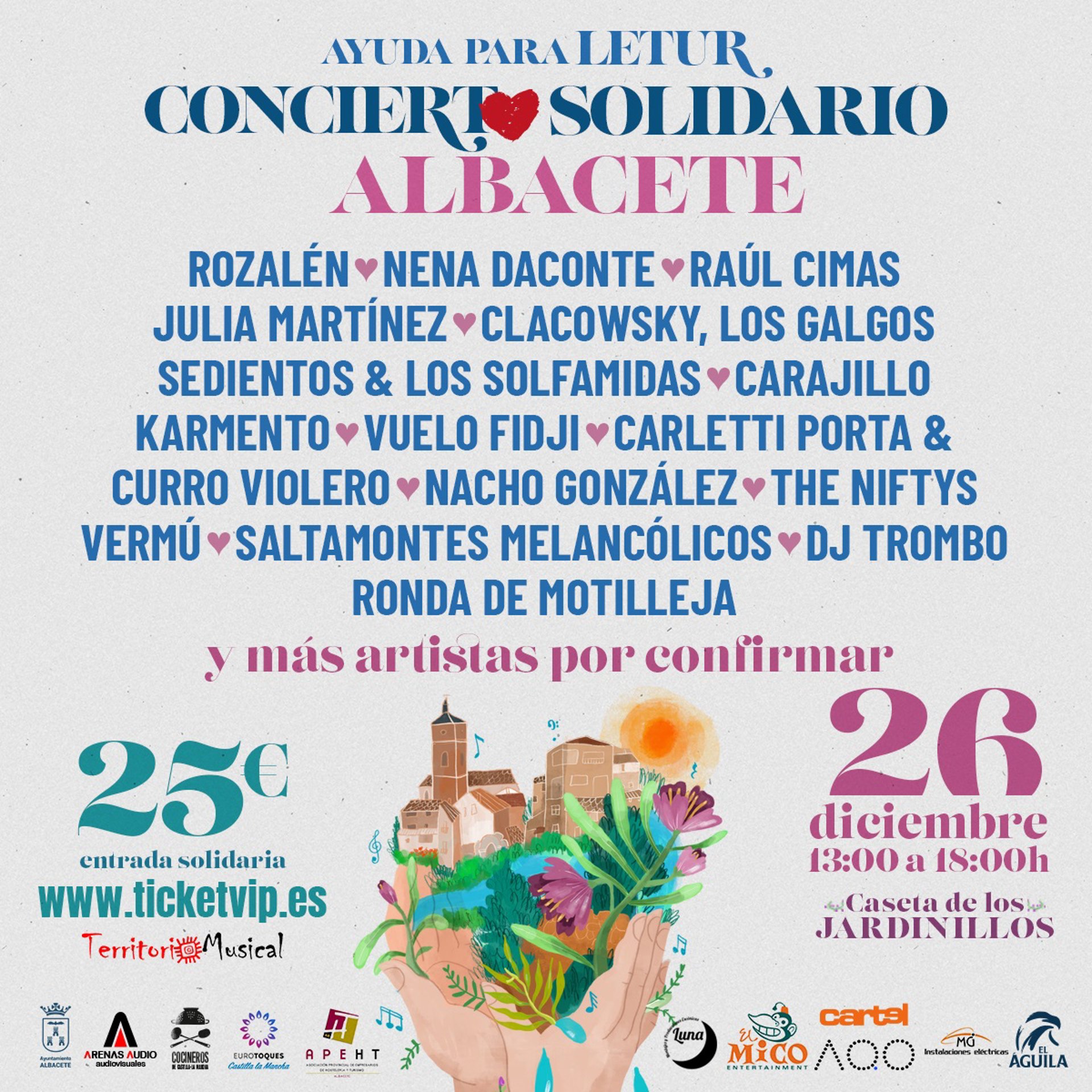 Todos ellos actuarán de forma desinteresada, al igual que los colaboradores que se han querido sumar, aportando su grano de arena, a la reconstrucción de Letur, caso de Arenas Audio, El Mico, Montajes y Producciones Escénicas Luna, El Aguila, Eurotoques, Asociación Provincial de Empresarios de Hostelería y Turismo de Albacete, MG Instalaciones Eléctricas, Cartel, Ticketvip, Ayuntamiento de Albacete, AQO Producciones y Territorio Musical.