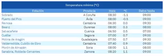 La lista de las diez temperaturas mínimas la lidera Sobrado (A Coruña), con -1,1 grados; seguida de Puerto del Pico, con -0,5; Reinosa (Cantabria), con 0,0; Beariz (Ourense), con 0,3; Salvacañete (Cuenca), con 0,5, y Cuéllar y Molina de Aragón (Guadalajara), con 0,7 en ambos casos.