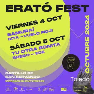 Erató Fest regresa a Toledo del 3 al 6 de octubre en el Castillo de San Servando en su 7ª edición con actuaciones de Samuraï, Tu Otra Bonita, Shego, Ede, Bita y Vuelo Fidji.