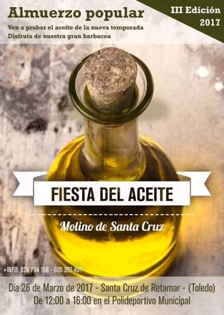 El Polideportivo Municipal del municipio toledano de Santa Cruz del Retamar acogerá el próximo domingo 26 de marzo la III Fiesta del Aceite, organizada por 'El Molino de Santa Cruz', empresa radicada en la zona desde los años 70, con la colaboración del Consistorio que ha cedido las instalaciones.