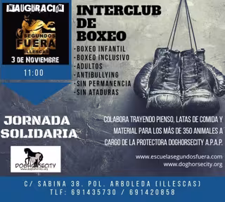 El gimnasio Segundos Fuera ha organizado un interclub de boxeo solidario en su nueva escuela de Illescas (Toledo) a favor de la protectora de animales Dog Horse City. Este evento tendrá lugar el día 3 de noviembre a las 11.00 horas coincidiendo con la inauguración de la escuela, que abrirá sus puertas al público el día de antes.