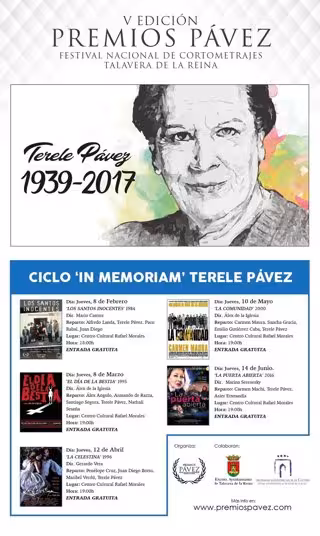 Este jueves, 8 de febrero, comienza el ciclo de películas en honor de la actriz Terele Pávez que el Festival Nacional de Cortometrajes de Talavera de la Reina (Toledo) ha organizado en memoria de la madrina que da nombre a los Premios Pávez, que se entregan en la ceremonia de clausura del festival --24 de junio--.