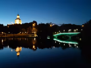 Archivo - El puente del lago del parque de 'La Alameda' de Talavera se ilumina de verde por el Día Mundial de la Salud Mental - ATAFES - Archivo