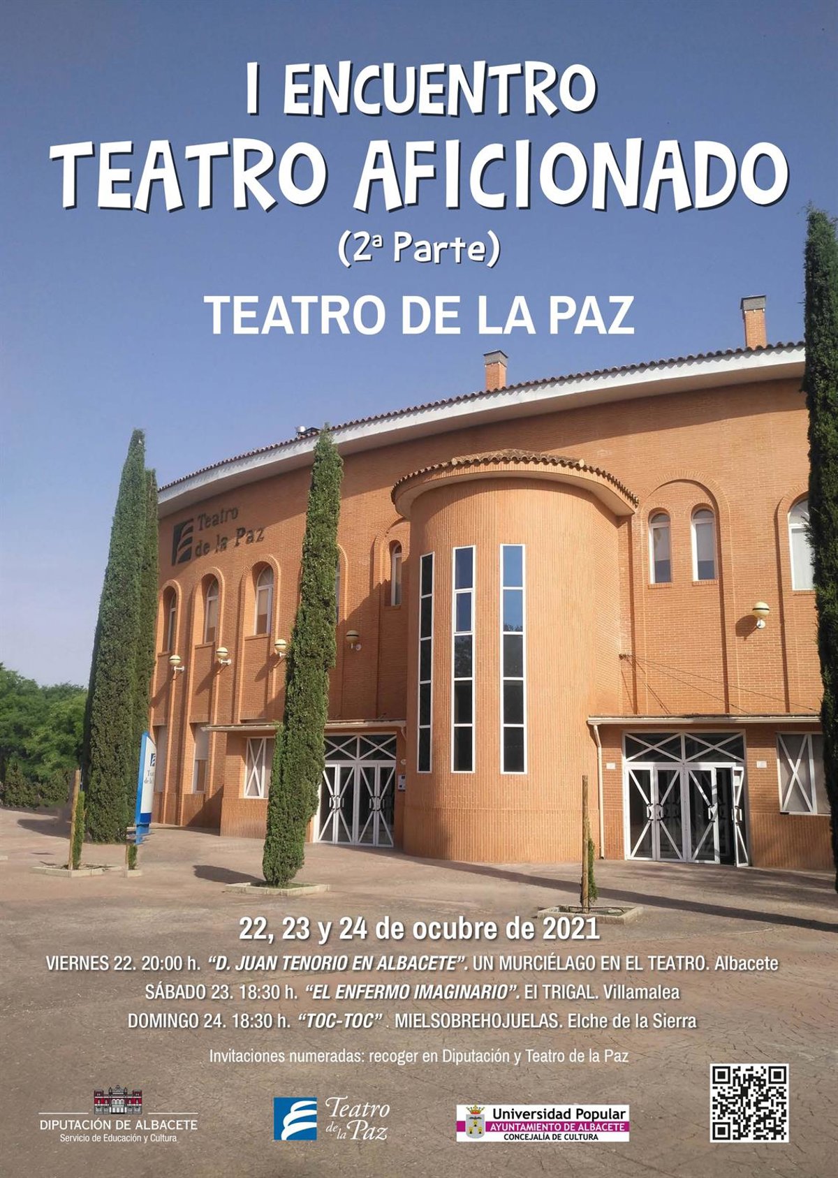 En esta segunda parte que ahora regresa se representarán las tres obras que tuvieron que cancelarse entonces por motivos sanitarios abriendo esta cita el viernes 22 de octubre la compañía albacetense, Un Murciélago Teatro, con 'Don Juan Tenorio en Albacete'; el programa continuará el sábado 23 con la participación de El Trigal de Villamalea y su adaptación de 'El enfermo imaginario' de Moliere; para finalizar con la obra 'Toc Toc' del grupo Mielsobrehojuelas de Elche de la Sierra que actuará el domingo 24.