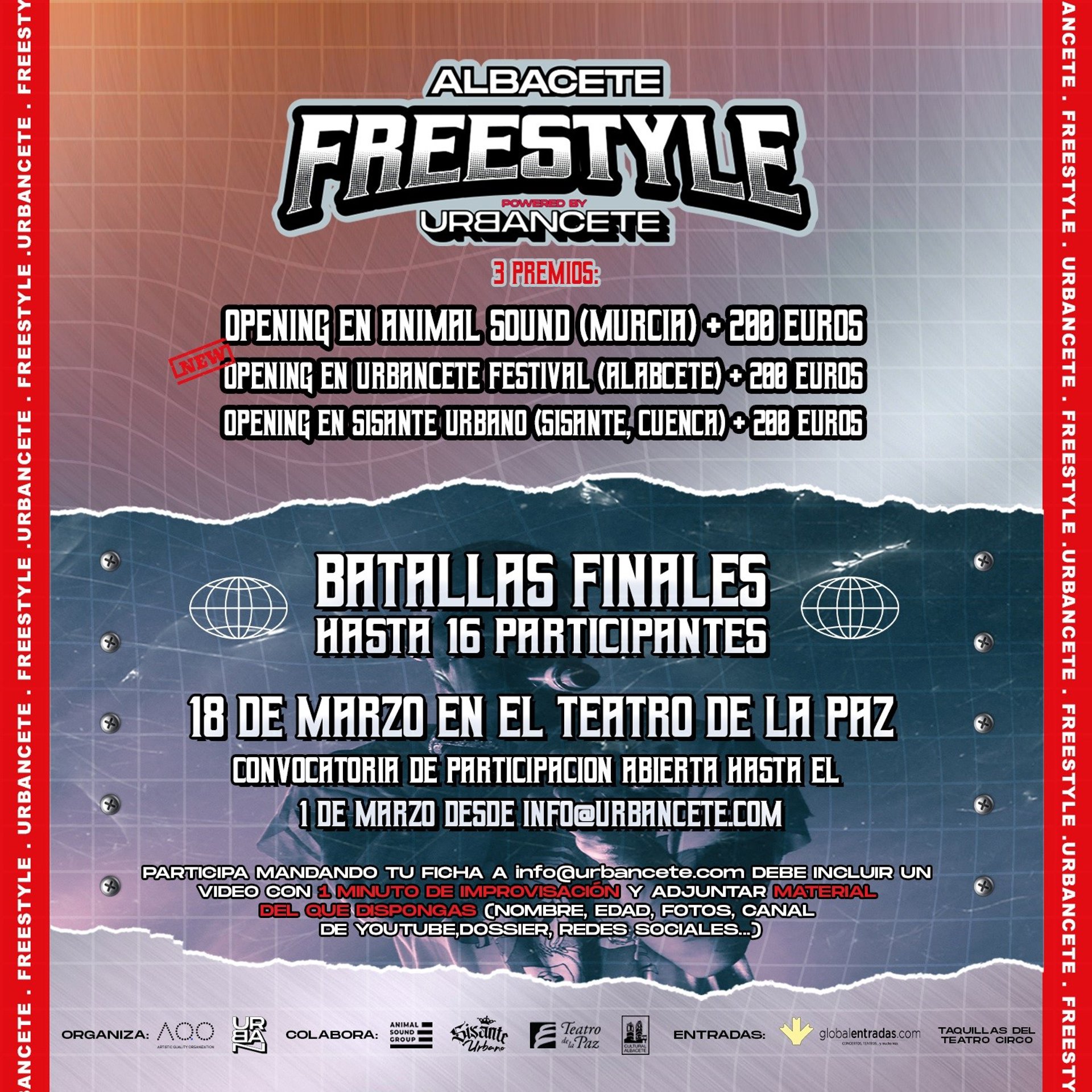 Para el concurso se seleccionarán a 16 participantes que competirán por formar parte del cartel de diferentes festivales de estilo urbano, además de una recompensa económica. Así, optarán a un primer premio basado 'opening' en Animal Sound de Murcia y 200 euros.