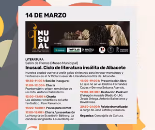 El Salón de Plenos del Museo Municipal de Albacete acoge este sábado, 14 de marzo una nueva edición del ciclo 'Inusual. Ciclo de literatura insólita de Albacete' una propuesta cultural que reúne a escritores, investigadores y divulgadores para explorar el universo de la literatura fantástica y sus grandes mitos.