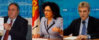 El secretario general del PP de Castilla-La Mancha, Vicente Tirado, la portavoz regional del partido, Carmen Riolobos, y el portavoz del Comité de Campaña, Leandro Esteban, acompañan a la presidenta regional de la formación, María Dolores de Cospedal, en la candidatura autonómica del Partido Popular por la provincia de Toledo.