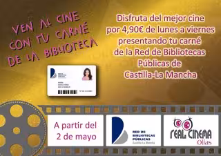 El Real Cinema Olías de Olías del Rey (Toledo) costará, a partir del 2 de mayo y de lunes a viernes, 4,90 euros presentando el carné de la Red de Bibliotecas de Castilla-La Mancha, gracias a la iniciativa 'Ven al cine con el carné de tu biblioteca'.