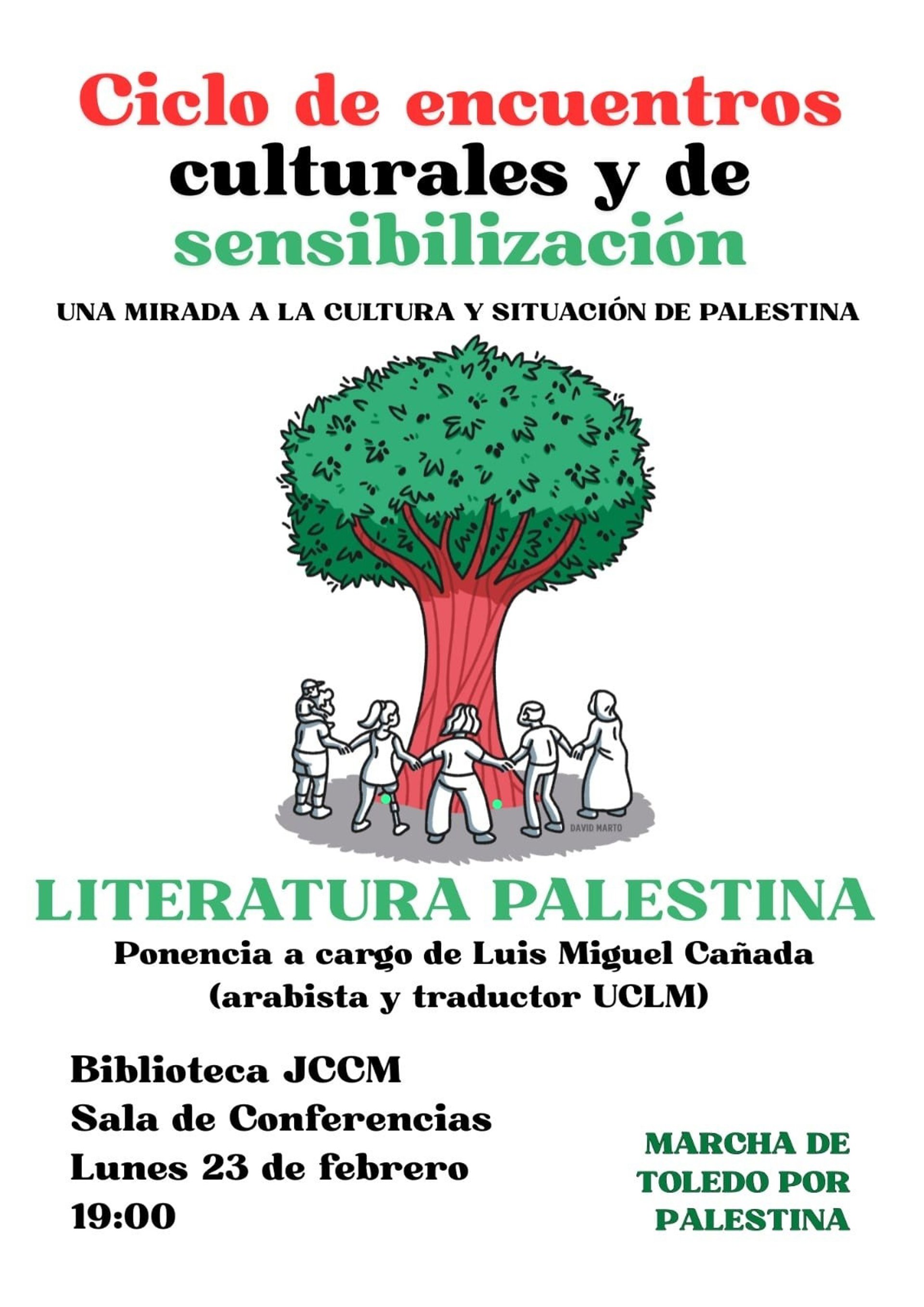 La ciudad de Toledo acogerá el próximo lunes, 23 de febrero, a las 19.00 horas una nueva sesión del 'Ciclo de encuentros culturales y de sensibilización: una mirada a la cultura y situación de Palestina', con la ponencia 'Literatura Palestina', a cargo del arabista y traductor Luis Miguel Cañada, profesor titular de literatura árabe de la Universidad de Castilla-La Mancha.