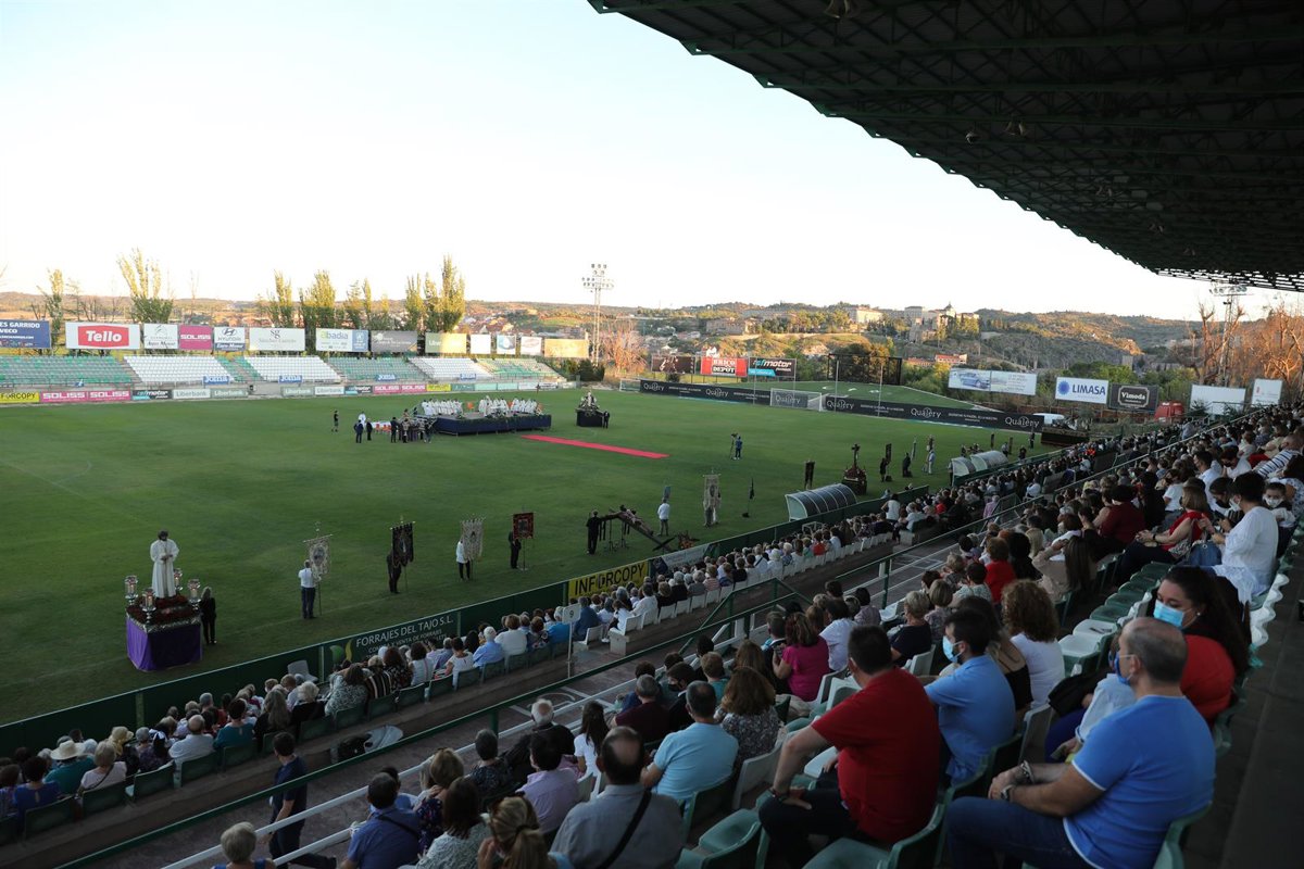Un total de 4.000 personas han participado este sábado en la eucaristía de inicio de curso de la Junta de Cofradías, Capítulos y Hermandades de Semana Santa de Toledo que, presidida por el arzobispo toledano, Francisco Cerro Chaves, se ha celebrado en el estadio Salto del Caballo de la capital regional.