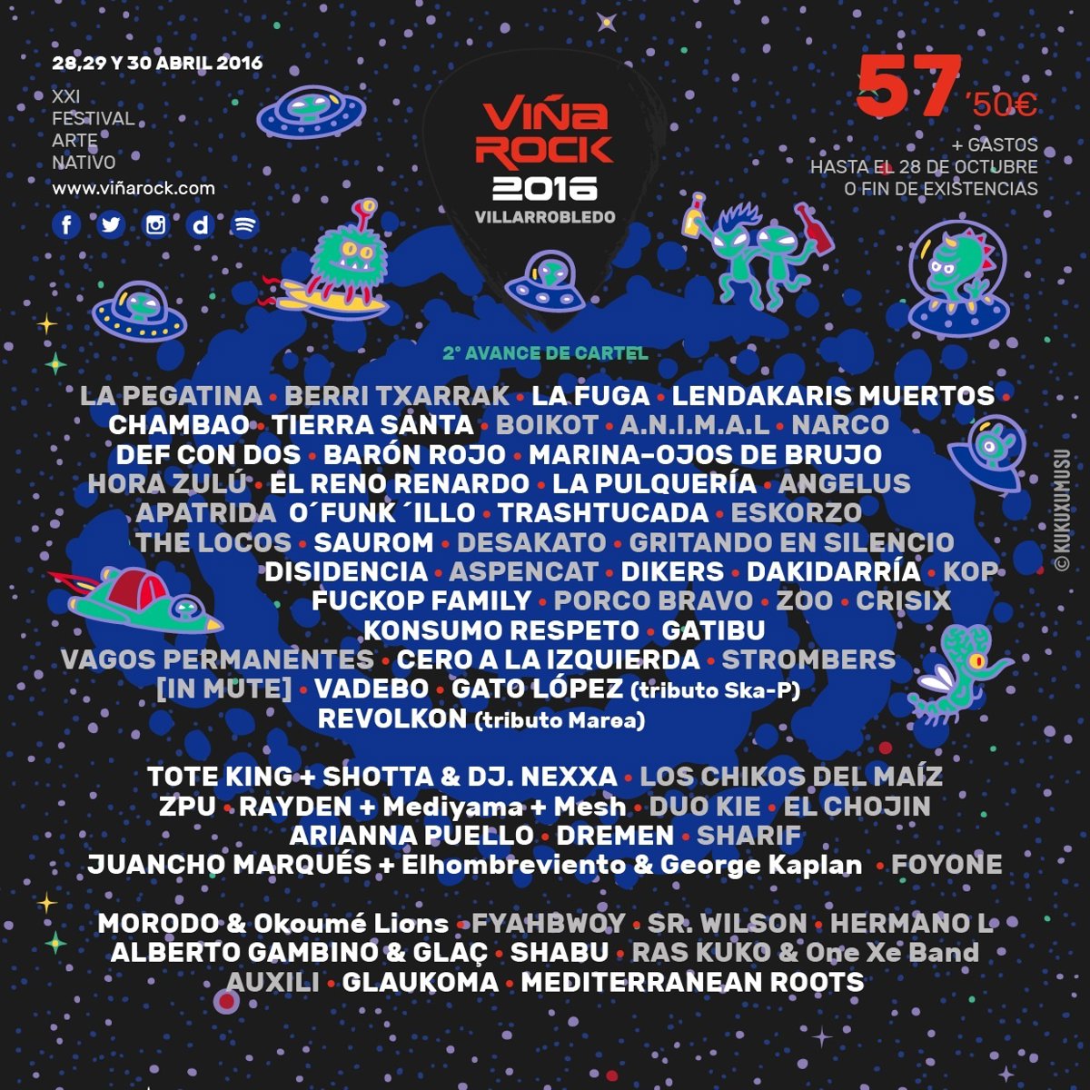 Se trata de La Fuga, Lendakaris Muertos, Chambao, Tierra Santa, Def Con Dos, Barón Rojo, Marina (Ojos de Brujo), El Reno Renardo, La Pulquería, Ofunkillo, Trashtucada, Saurom, Disidencia, Dikers, Dakadarria, Fuckop Family, Konsumo respeto, Gatibu, Cero a la izquierda, Tote King + Shotta & Dj Nexxa, Zpu, Rayden, Ariana Puello, Dremen y muchos más.