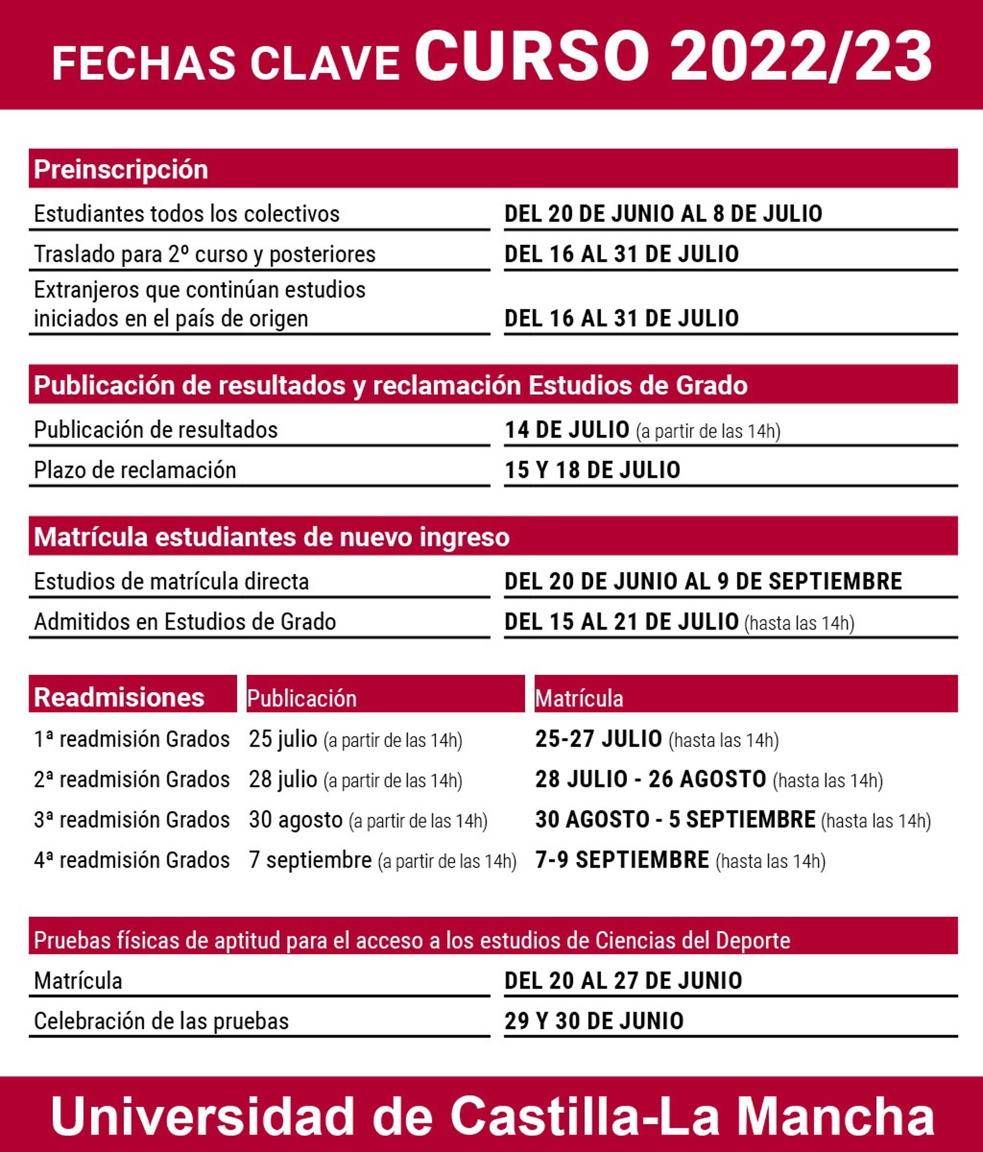 Una vez concluido el proceso de preinscripción y ordenadas las solicitudes, la Universidad de Castilla-La Mancha publicará los resultados a partir de las 14.00 horas del 14 de julio. Posteriormente, se publicarán nuevas readmisiones los días 25 y 28 de julio, 30 de agosto y 7 de septiembre. Todo el procedimiento está detallado en la Guía de preinscripción publicada en la web de la UCLM, según ha informado la Universidad en nota de prensa.