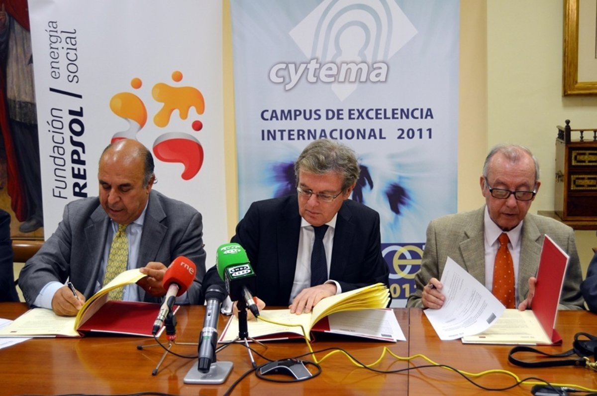 El rector de la Universidad de Castilla-La Mancha (UCLM), Miguel Ángel Collado; el presidente del Consejo Social de la institución académica, Miguel Panadero; y el vicepresidente de Fundación Repsol, César Gallo, han firmado en Ciudad Real un convenio de colaboración que permitirá la puesta en marcha de un nuevo programa de becas destinado a impulsar el acceso a la universidad de estudiantes con discapacidad. Al acto ha asistido el presidente del Comité Español de Representantes de Personas con Discapacidad (CERMI) en Castilla-La Mancha, Luis Perales.