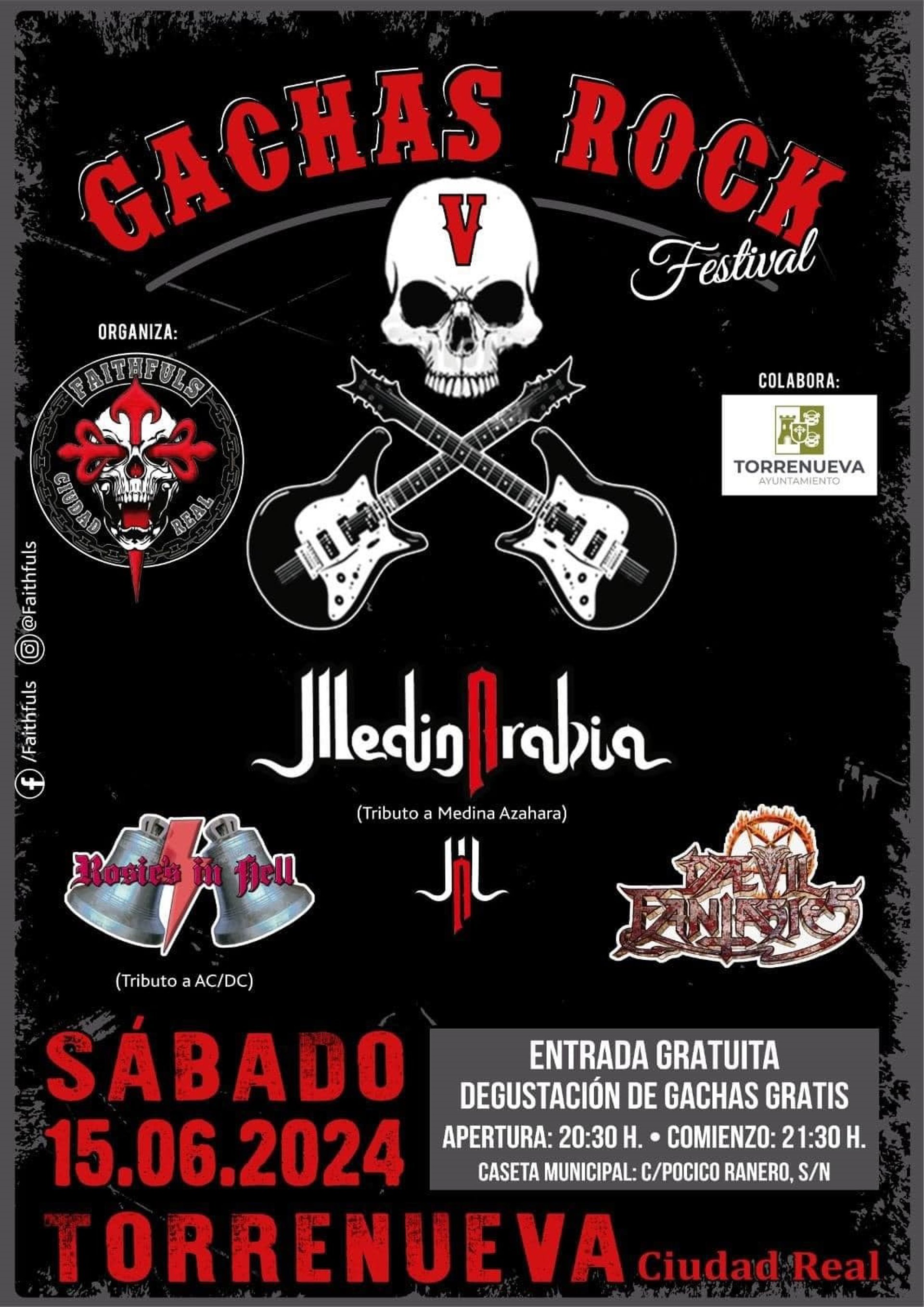 La apertura, a partir de las 21.30 horas, correrá a cargo del grupo Devil Fantasies; a las 23.30 horas como cabeza de cartel actuará MedinArabia, que ofrecerá un tributo a Medina Azahara, y cerrará a la 1.30 horas Rosie's in hell, único tributo femenino en España a AC/DC. Para terminar unas gachas gratis para todos los asistentes.