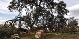 Unidos bajo el nombre de 'Amigos de Ruli', estos vecinos ya han actuado colocando palés para sujetar a esta carrasca a la que se quebró una de sus enormes ramas pero, según han señalado en las redes, "no es suficiente".