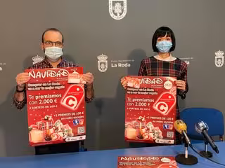 La concejal de Comercio del Ayuntamiento de La Roda, María José Fernández y el secretario de la Asociación de Comerciantes, Isidro Pastor, han presentado en rueda de prensa la campaña de Navidad que, en esta edición, pretende repartir 2.000 euros en premios que se distribuirán en 4 sorteos de 500 euros y cinco premios de 100 que se repartirán en redes sociales.