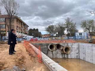 El alcalde de Toledo, Carlos Velázquez, ha visitado las obras de la balsa de Azucaica que está ejecutando el Ayuntamiento para comprobar su funcionamiento y la capacidad de respuesta del sistema ante las lluvias de los últimos días.