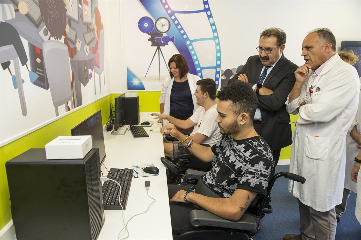 Un videojuego de ordenador que permite realizar ejercicios con la mano y ver su movimiento en la pantalla mientras realizas diferentes misiones es una de las actividades que pacientes jóvenes del Hospital Nacional de Parapléjicos pueden llevar a cabo en el nuevo espacio cultural y de ocio virtual que ha comenzado a funcionar en el centro.