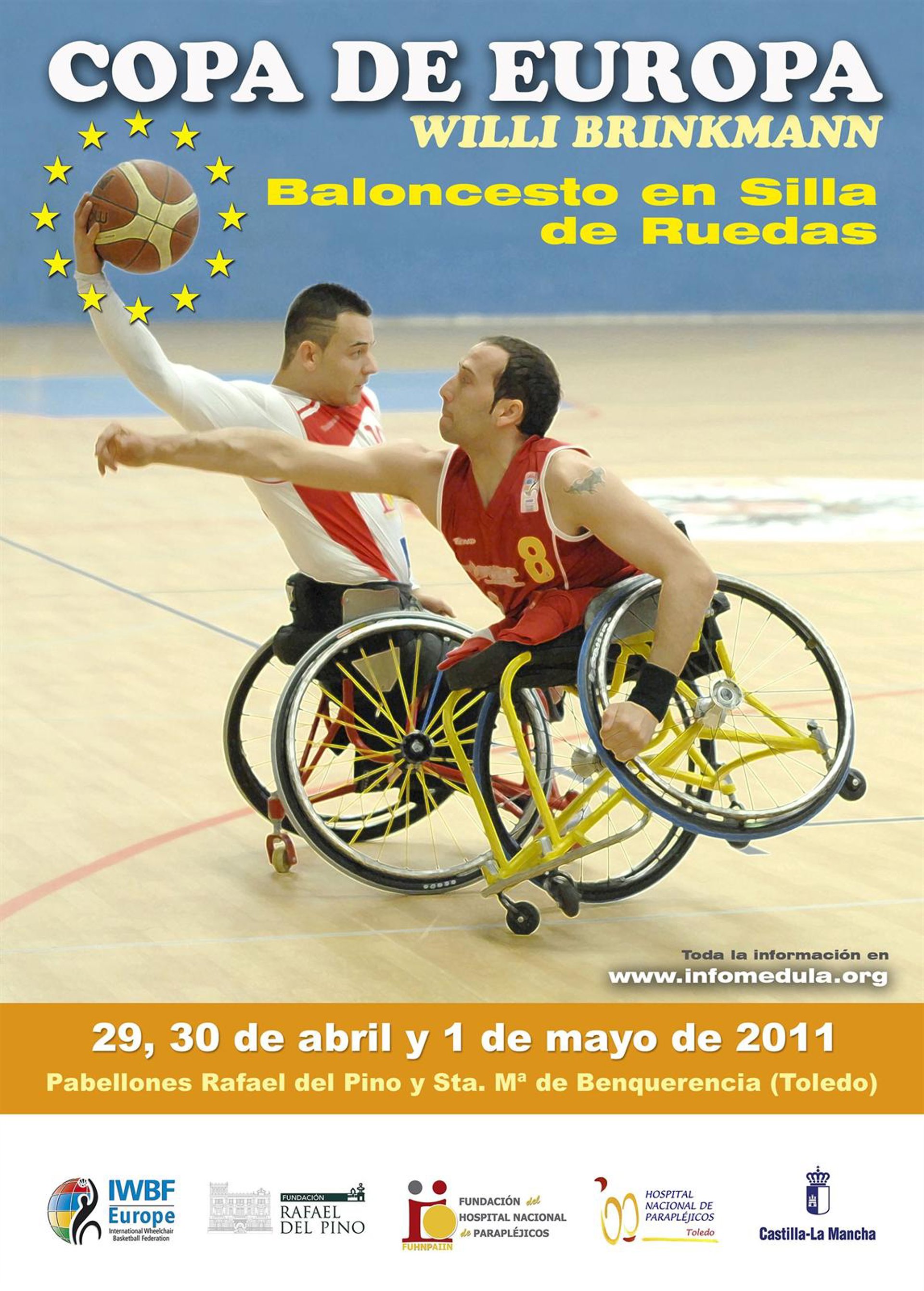 Ocho equipos de cinco nacionalidades europeas participan los próximos días 29 y 30 de abril y 1 de mayo en la Copa de Europa de Baloncesto en Silla de Ruedas Willi Brinkmann, evento deportivo cuya final tendrá lugar en el Complejo Polideportivo 'Rafael del Pino' en Toledo, situado junto al Hospital Nacional de Parapléjicos.