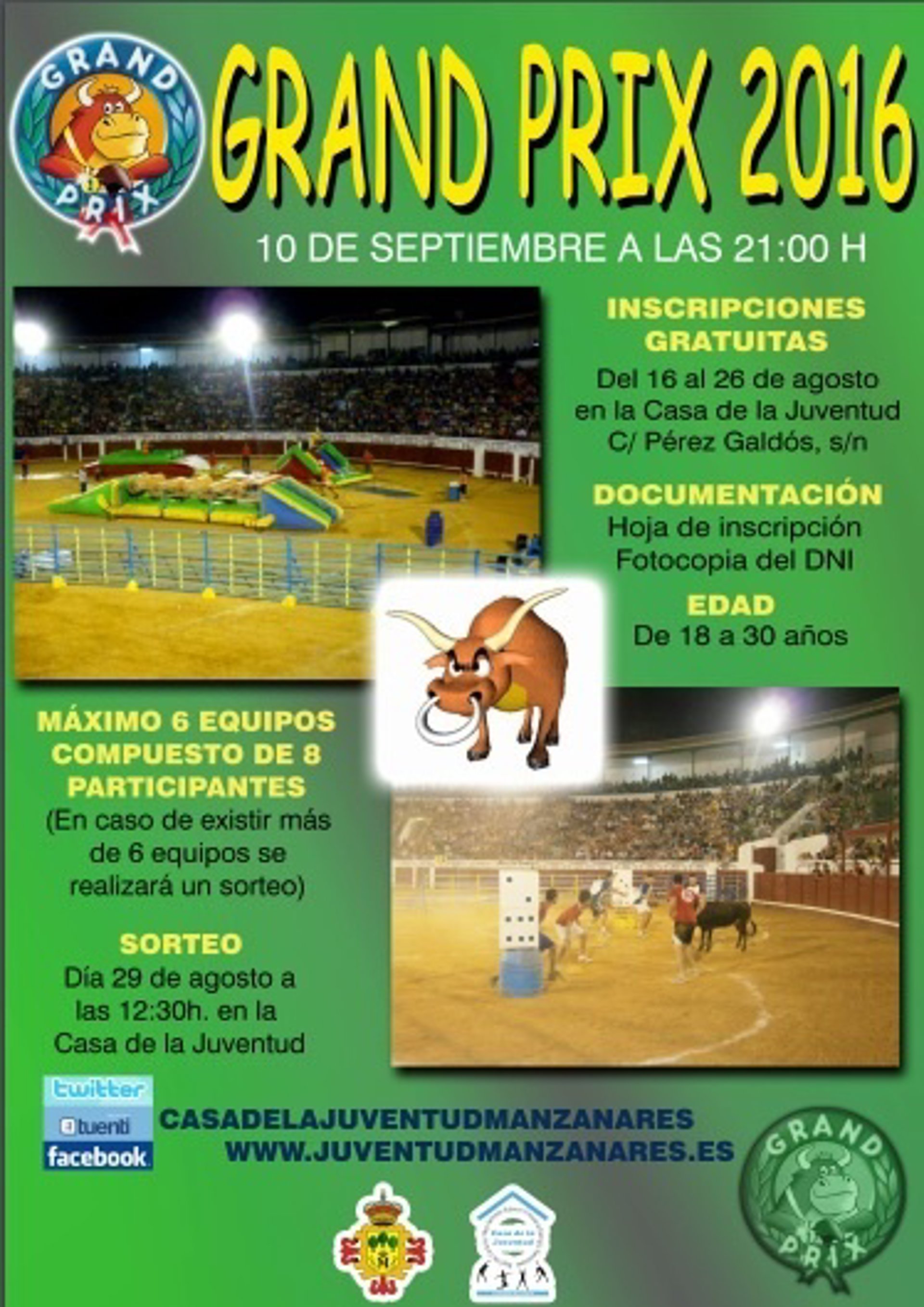 El próximo 10 de septiembre a las 21.00 horas, en la Plaza de Toros de Manzanares (Ciudad Real) tendrá lugar el 'Grand Prix' 2016. Toda aquella persona que quiera participar, asociaciones, peñas o grupos, tienen de plazo para formalizar la inscripción hasta este viernes, 26 de agosto.
